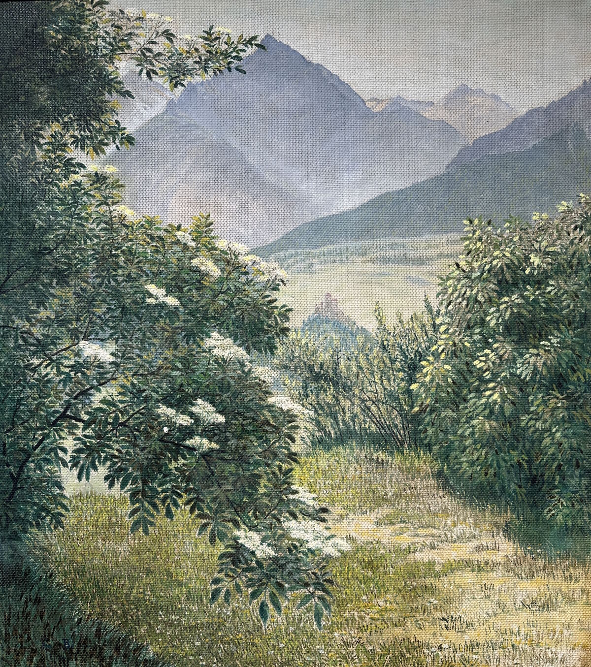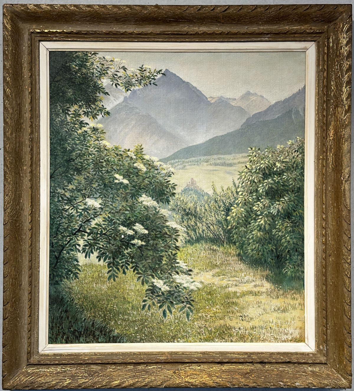 Abmessung: 67 cm x 59 cm. Unten links kaum sichtbar signiert und datiert: Hans Beyer, 1947. Rückseitig mit Kugelschreiber betitelt: Holderbusch mit Piz San Jon. Im Original Rahmen (86 cm x 77 cm).