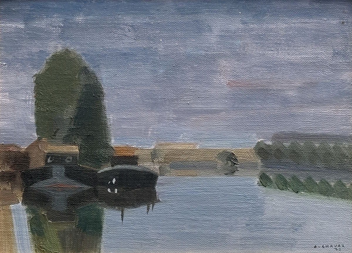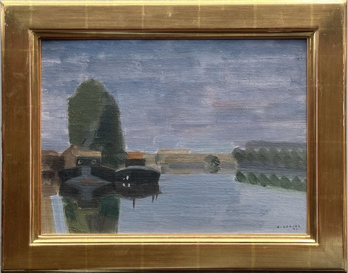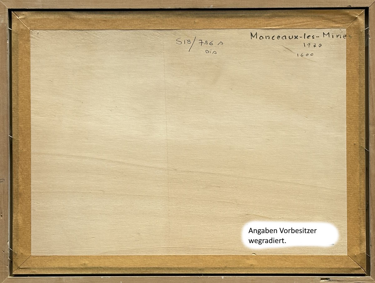 Abmessung: 27 cm x 36 cm. Unten rechts signiert und datiert: A. Chavaz 70. Rückseitig auf der Platte betitelt. Hochwertige, über Eck vergoldete Rahmung (37 cm x 47 cm).