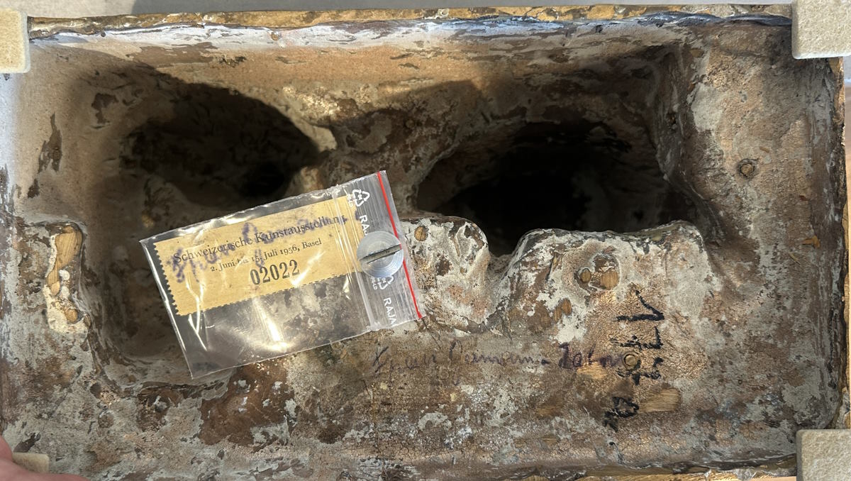 Abmessung: 38 x 30 x 16 cm. Auf der Inneseite unten mit einem Stift voll signiert "Frau Germann Jahn". Auf dem Ticket der Schweizerischen Kunstausstellung von 1956 nochmals signiert.
