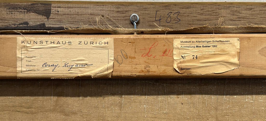 Ausstellung: Max Gubler, Zürich, Kunsthaus, 6.12.1952–Mitte Januar 1953 ; Max Gubler. Gesamtausstellung, Schaffhausen, Museum zu Allerheiligen, 1.9.–28.10.1962 (Jeweils mit Etiketten auf dem Keilrahmen).