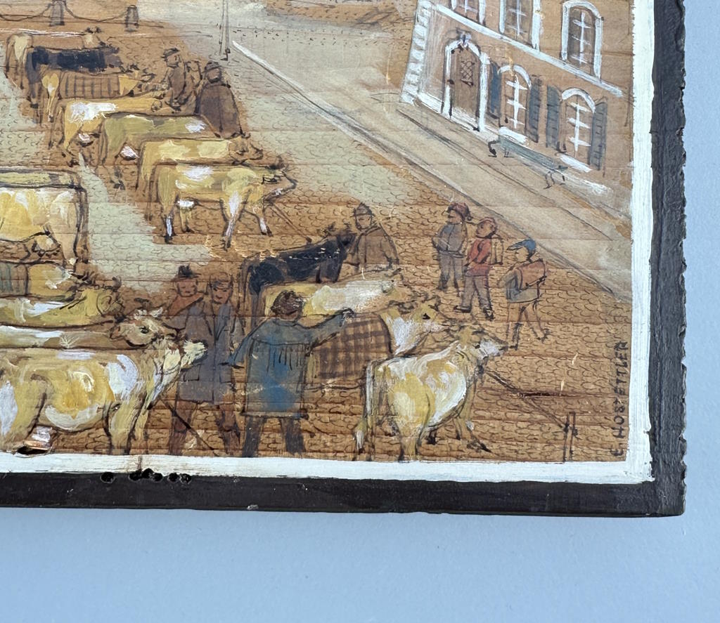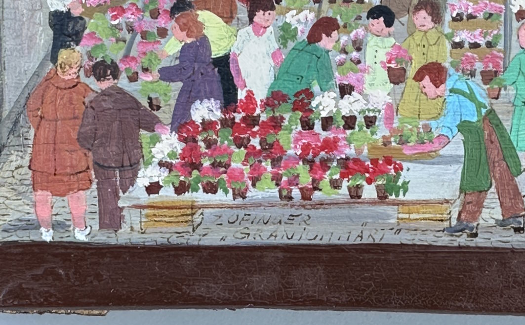 Abmessung: 21 cm x 44 cm. Unten links betitelt "Zofinger Granienmärt", rechts signiert und datiert E. Hostettler 74.