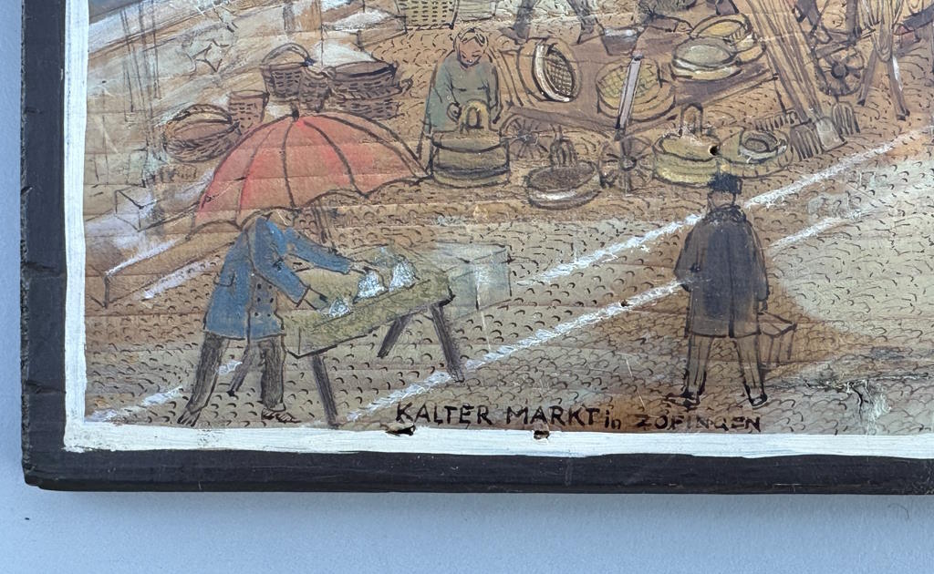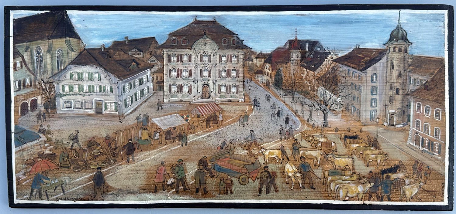 Abmessung: 24 cm x 51 cm. Unten links betitelt "Kalter Markt in Zofingen", rechts signiert E. Hostettler