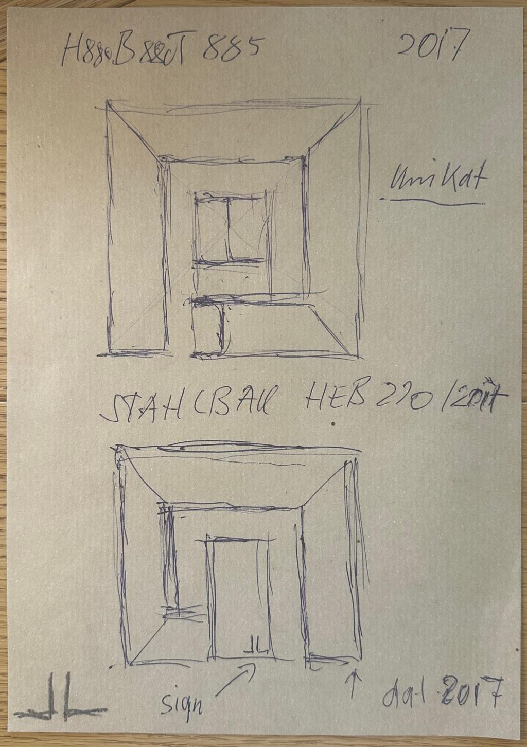 Mit dabei ist eine handschriftliche Werkbeschreibung mit Skizze (A4 Format) von James, datiert 2023. Auch ein Foto ist vorhanden, welches James zusammen mit dem Stahlbau zeigt.