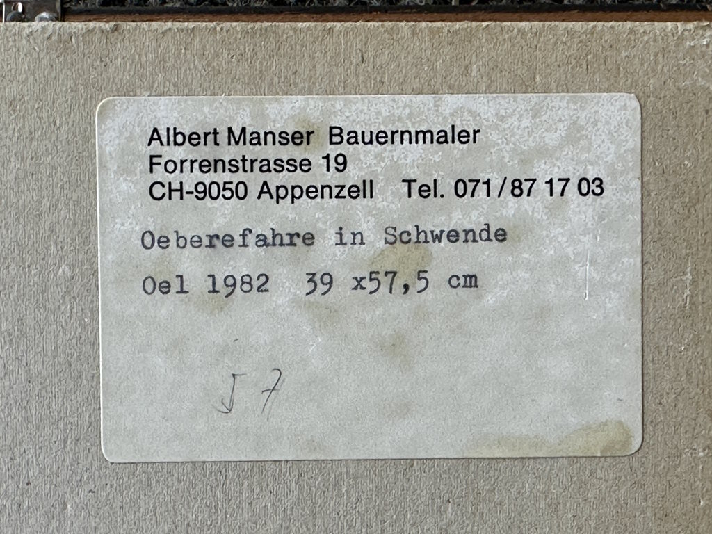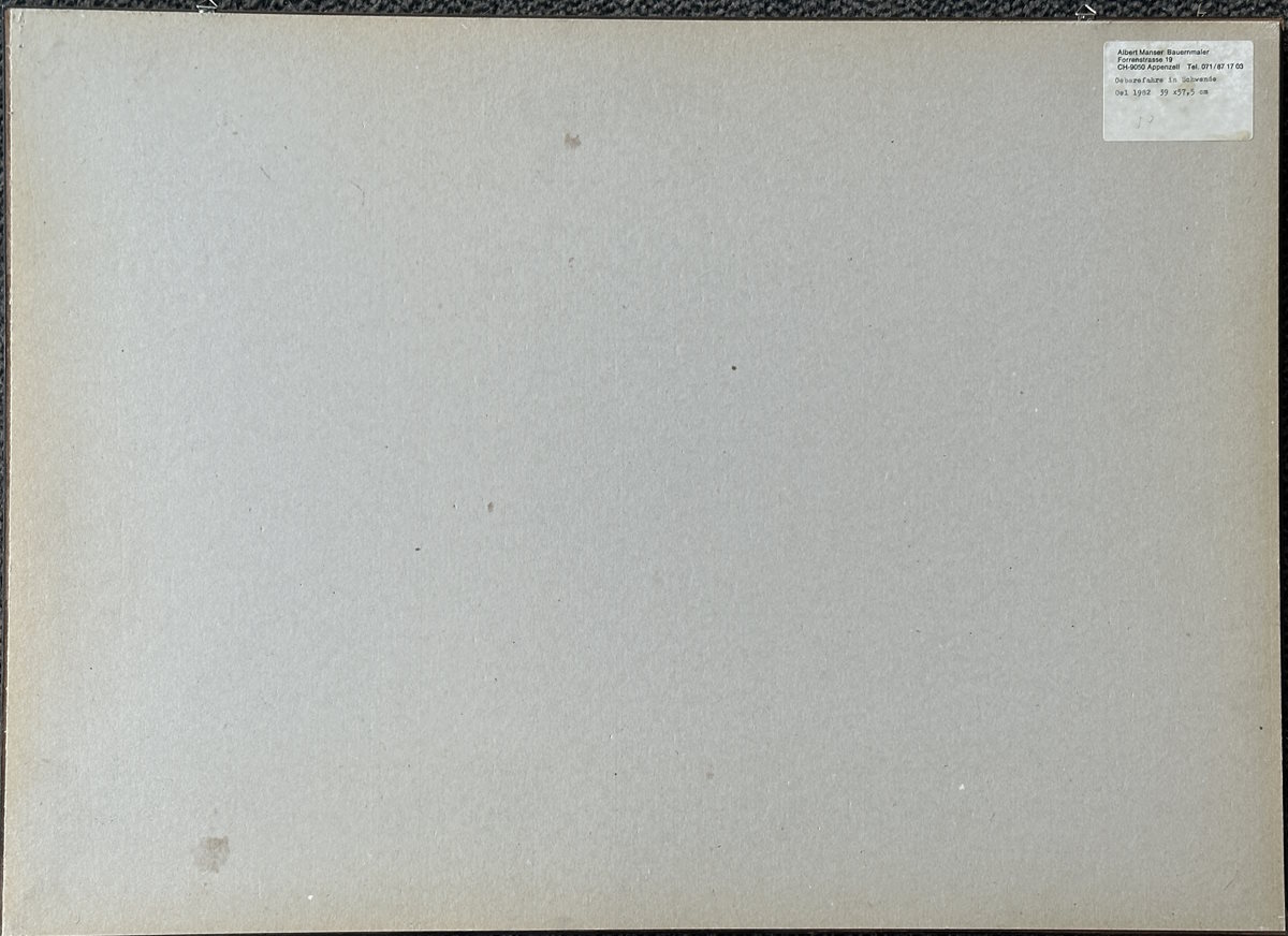 Abmessung: 39 cm x 57.5 cm. Unten links signiert und datiert Alb. Manser 82. Auf der Rückseite mit der Etikette des Künstlers. Im Original-Rahmen.