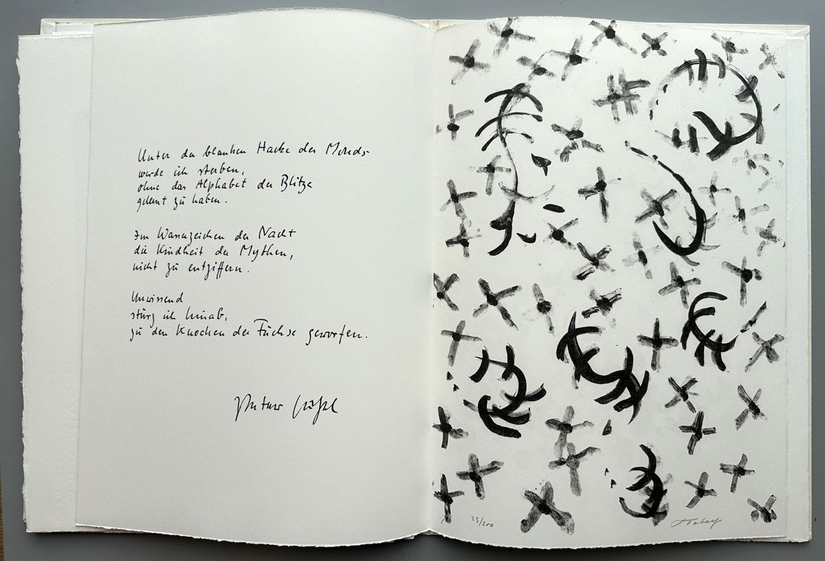 Jede auf Doppelbogen, Abmessung 38 cm x 56 cm. Jedes Blatt vom jeweiligen Künstler signiert und nummeriert 23/200.