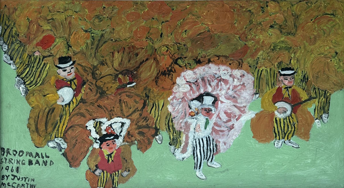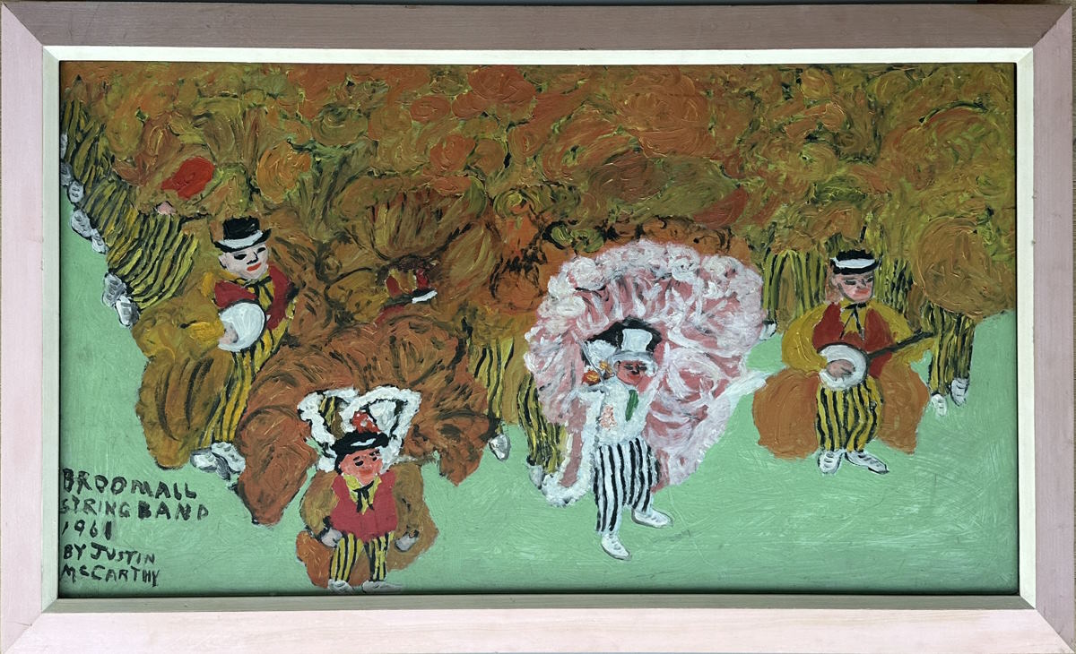 Abmessung: 50 cm x 90 cm. Unten links im Bild signiert, datiert und betitelt: Broomall String Band, 1961. By Justin Mccarthy. Gerahmt und hinter Glas (62 cm x 101 cm).
