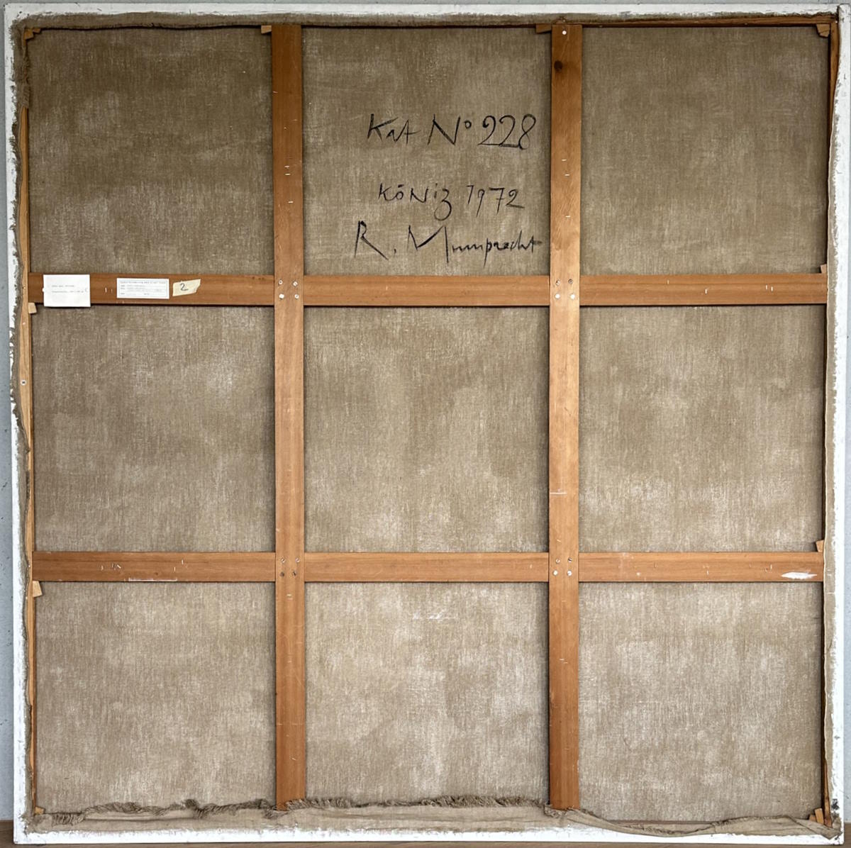 Abmessung: 195 cm x 195 cm. Rückseitig auf der Leinwand vom Künstler signiert, datiert und mit Werknummer versehen: Kat.No 228 - Köniz 1972 - R. Mumprecht.