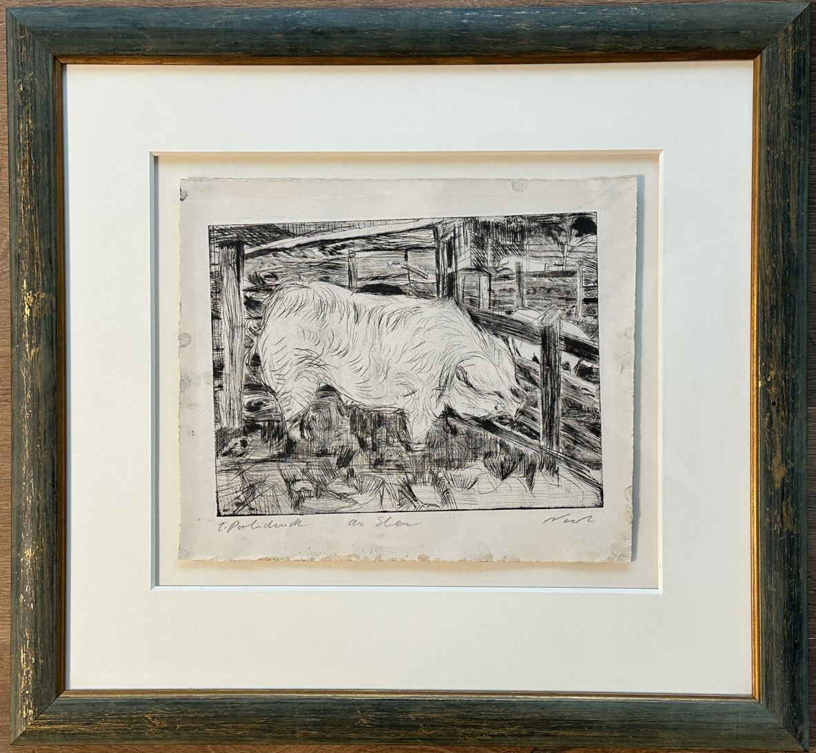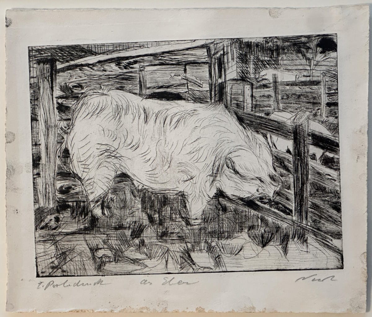 Abmessung: Plattenkante 24.4 cm x 32.7 cm. Blattgrösse 32.2 cm x 38.4 cm. Unten rechts signiert Nesch, mittig betitelt: ein Eber und links bezeichnet mit 1. Probedruck. Gerahmt und hinter Glas (61 x 66 cm).
