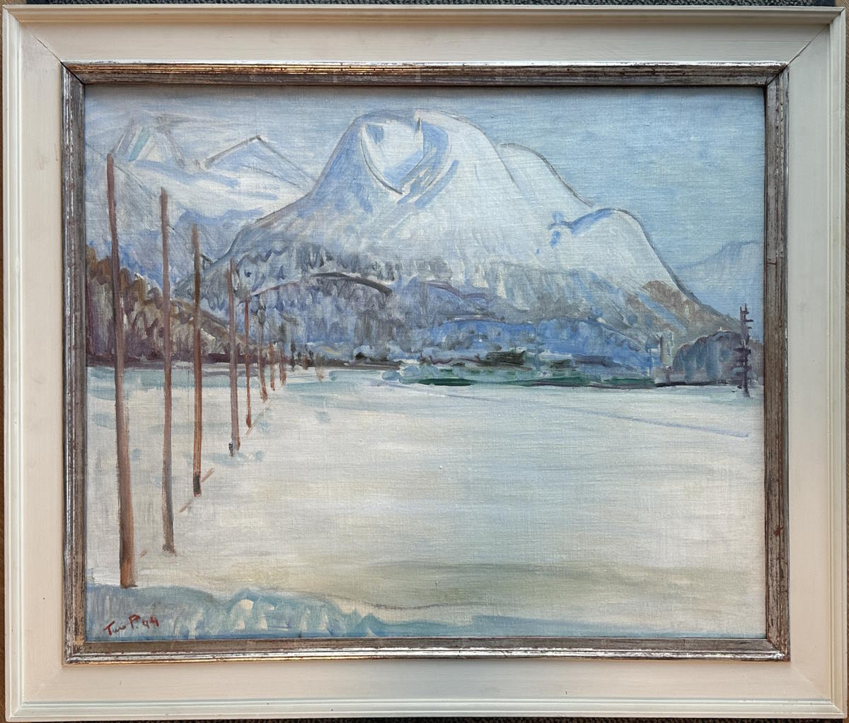Abmessung: 61 x 75 cm. Unten links signiert Turo Pedretti. Rückseitig auf der Leinwand vom Künstler betitelt, signiert und datiert: der Berg - Engadiner Landschaft - Turo Pedretti 1944. Gerahmt.