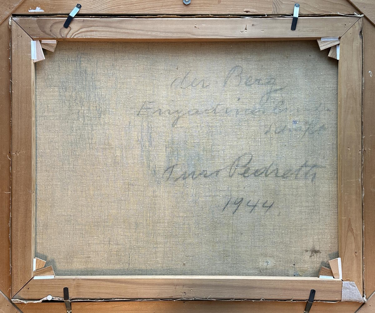 Im Winter 1951 ist das 1946 erstellte Wohnhaus mit Atelier von Pedretti (auf Cristolais über Samedan) durch eine Lawine komplett zerstört worden. Turo Pedretti wurde schwer verletzt und über 400 seiner Bilder sind zerstört worden. Das hier Angebotene Bild ist nur leicht beschädigt worden, und konnte durch Pedrettis Söhne restauriert werden.