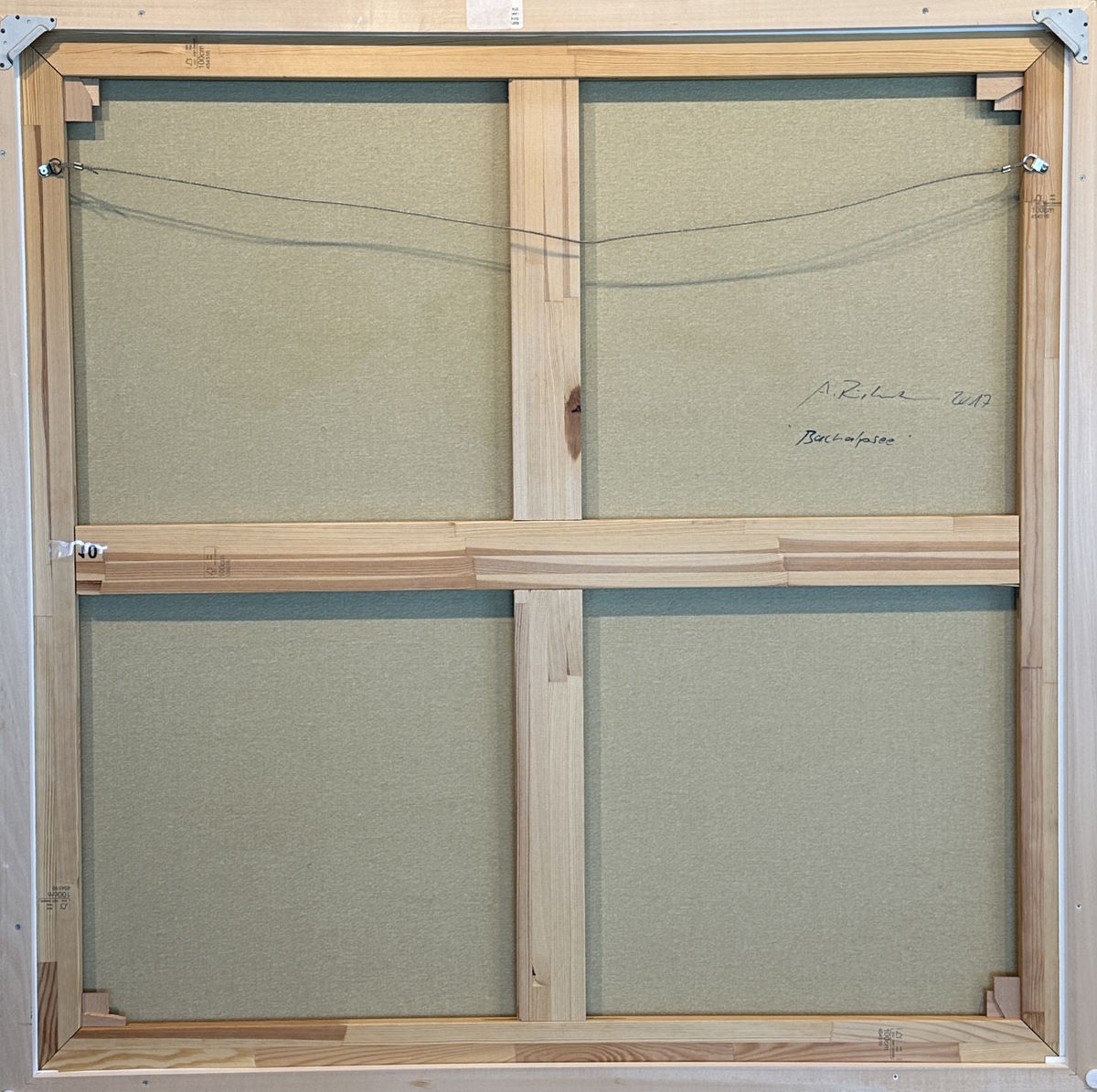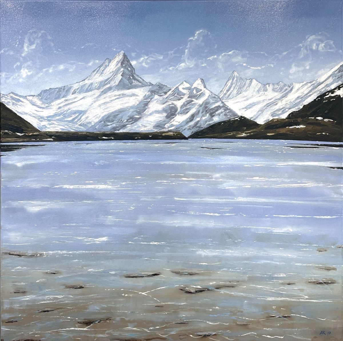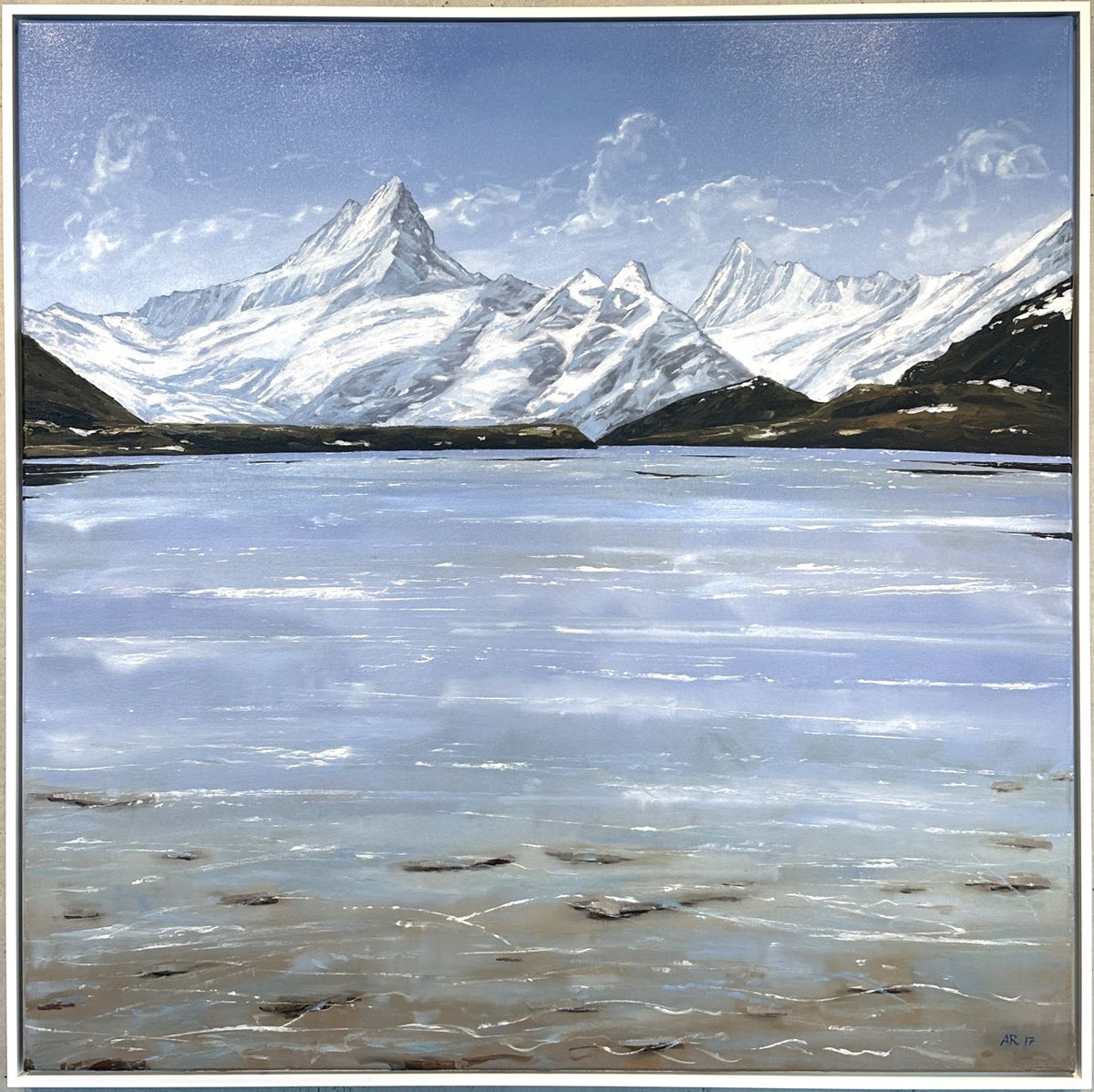 Abmessung: 100 cm x 100 cm. Unten rechts monogrammiert und datiert: AR 17. Rückseitig auf der Leinwand vom Künstler nochmals signiert, datiert und betitelt: A. Rickenbacher - 2017 - Bachalpsee. Gerahmt mit einem modernen Schattenfugenrahmen.