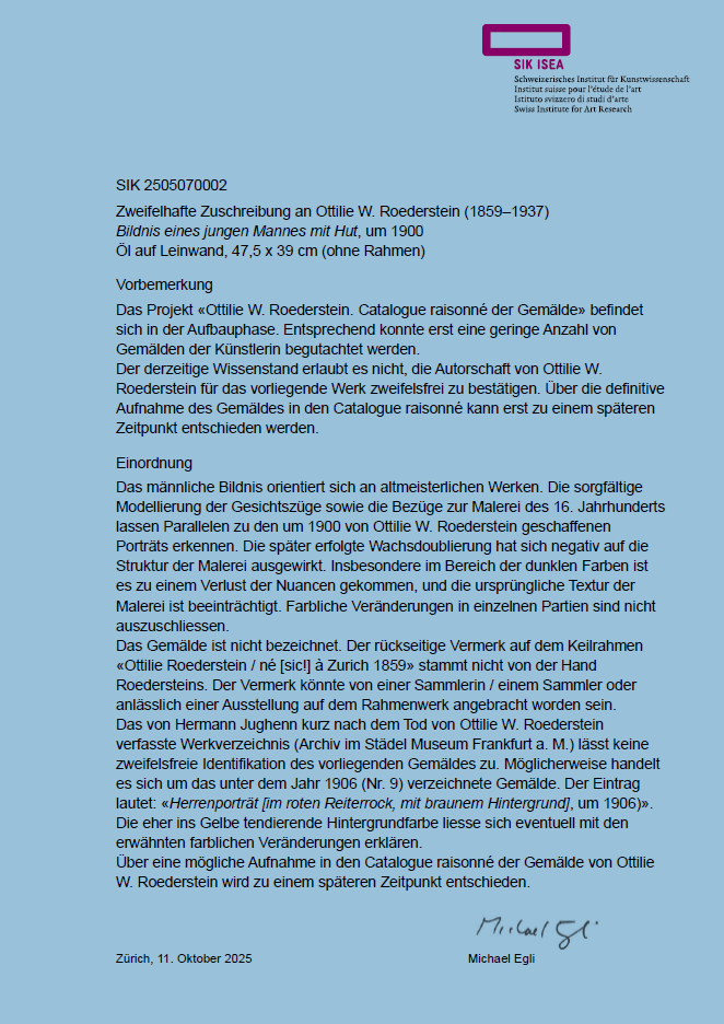 Dieses Bild ist beim SIK mit der Nummer 2505070002 wie folgt dokumentiert und archiviert: Über eine mögliche Aufnahme in den Catalogue raisonné der Gemälde von Ottilie W. Roederstein wird zu einem späteren Zeitpunkt entschieden, da sich der Catalogue noch in der Aufbauphase befindet. Das Schreiben vom SIK SIK-2505070002.pdf, datiert 11.10.2025, bildet ein Bestandteil beim Kauf dieses Bildes.