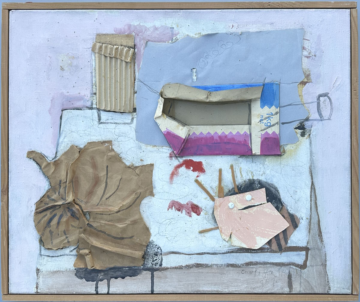 Collage auf Leinwand (Ölfarben, bemalter Karton, Zündhölzer, Papier)