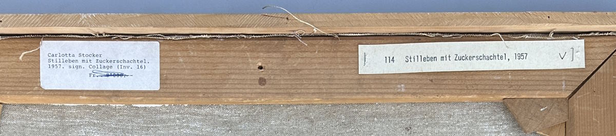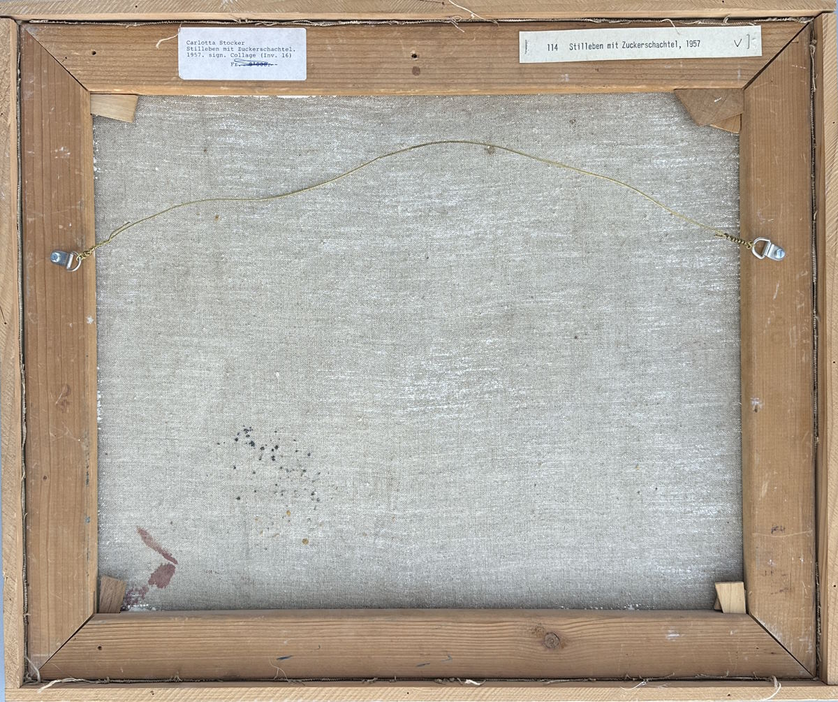 Abmessung: 46 cm x 56 cm. Unten rechts voll signiert und datiert: Carlotta Stocker 957. Rücksetitig auf dem Keilrahmen mit einer Künstleretikette und einer Ausstellungsetikette. Gerahmt mit einer Künstlerliste.
