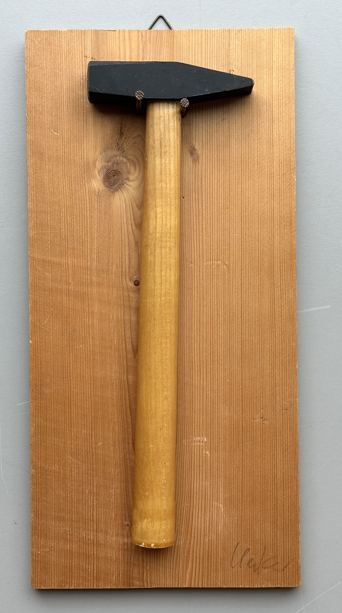 Technik: Hammer und 2 Nägel auf Weichbrettholz, mit Aufhänger.