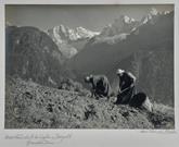Blühender Garten in Soglio, im Hintergrund die Sciora Gruppe